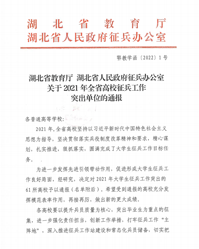 日前,湖北省教育厅和湖北省人民政府征兵办公室联合发文,对2021年全省高校征兵工作突出单位进行通报表彰,乐鱼(中国)官方获评全省高校征兵工作突出单位。