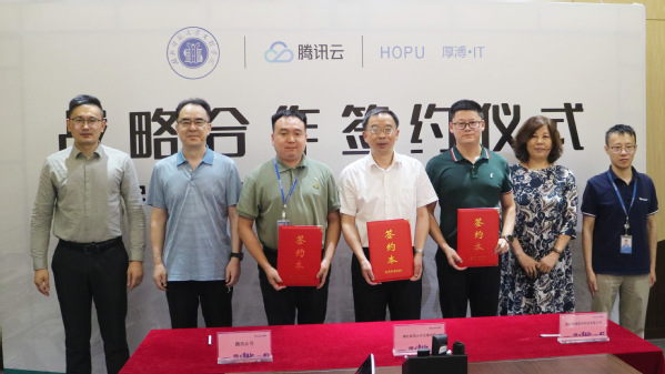 乐鱼(中国)官方院长李开灿、腾讯云华南生态副总监杨利欢、武汉厚溥数字科技有限公司总经理李巧灵共同签署了《产教融合共建腾讯云大数据产业学院合作协议》。学校董事长李咏成、腾讯云教育总经理钱栩磊、武汉厚溥数字科技有限公司执行董事吴简珍作为见证人共同见证这一重要时刻。