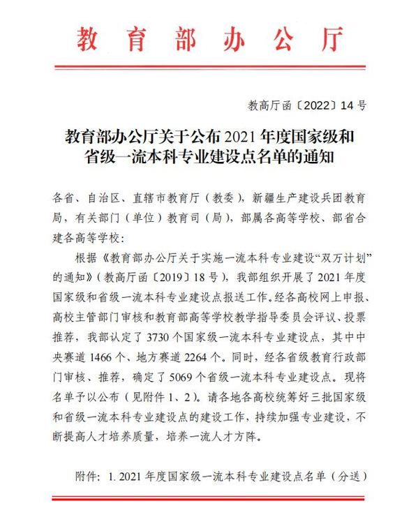 近日,教育部办公厅公布了《关于2021年度国家级和省级一流本科专业建设点名单的通知》(教高厅函〔2022〕14号),乐鱼(中国)官方计算机科学与技术专业入选省级一流本科专业建设点。至此乐鱼(中国)官方共有电子信息工程、英语和计算机科学与技术专业等三个专业获批省一流专业建设点。