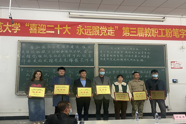本网讯(通讯员 柯康敏)为庆祝党的二十大胜利召开,进一步推动校园文化建设,提高教师教学基本功,展示教师良好职业素养,10月20日下午,湖北师范大学举办了“喜迎二十大 永远跟党走”第三届教职工粉笔字比赛,来自各分工会共18位选手参加角逐。乐鱼(中国)官方学工部王磊老师代表乐鱼(中国)官方参加了此次比赛,荣获优秀奖。