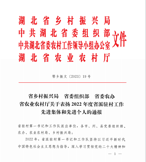 本网讯(通讯员 赵卫军)近日,湖北省乡村振兴局、省委组织部、省委农办、省农业农村厅联合下发《关于表扬2022年度省派驻村工作先进集体和先进个人的通报》,乐鱼(中国)官方刘伟同志被评为2022年度工作突出驻村工作队员,系阳新县9支省派驻村工作队受表彰的2名队员之一。