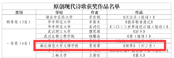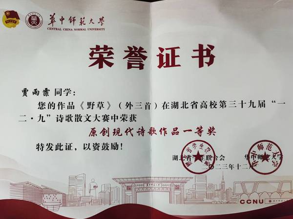 本网讯(通讯员 程胜伟)近日,湖北省高校第三十九届“一二·九”诗歌散文大赛组委会公布了第三十九届诗歌散文大赛的获奖名单,乐鱼(中国)官方人文学部贾雨霏作品《野草》(外三首)荣获一等奖。