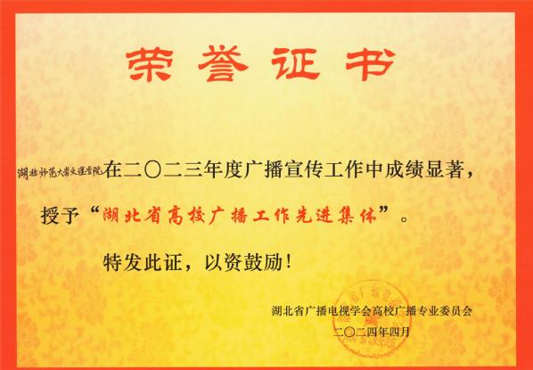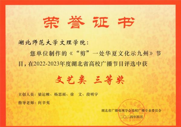 本网讯(通讯员 张慧萍)4月19日,全省高校广播专业委员会工作会议在湖北经济学院召开。会议通报了2022-2023 年度湖北省高校广播节目评选结果,乐鱼(中国)官方广播台获“湖北省高校广播工作先进集体”的荣誉称号,向辛夷老师指导的《“剪”一处华夏文化示九州》节目,荣获“文艺类”三等奖,王婉馨老师指导的《校园新闻》节目,荣获“新闻类”三等奖。