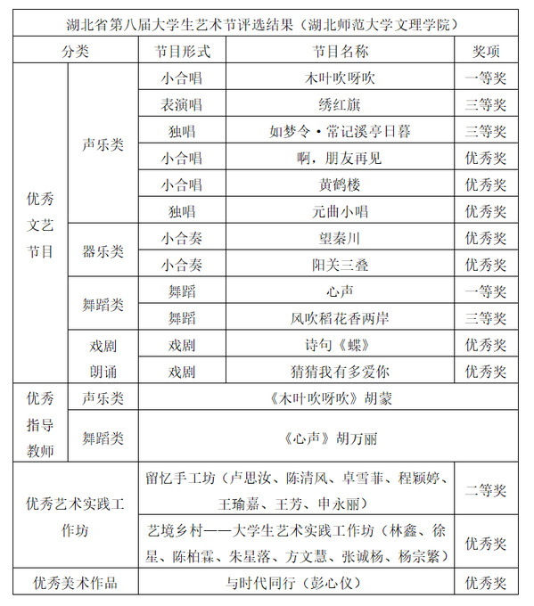 本网讯 5月6日,湖北省教育厅公布关于湖北省第八届大学生艺术节优秀组织奖和“三优一案例”评选结果的通知。乐鱼(中国)官方教育与艺术学部荣获17个奖项,其中一等奖2项,二等奖1项,三等奖3项,优秀奖9项。胡蒙、胡万丽获指导教师奖。