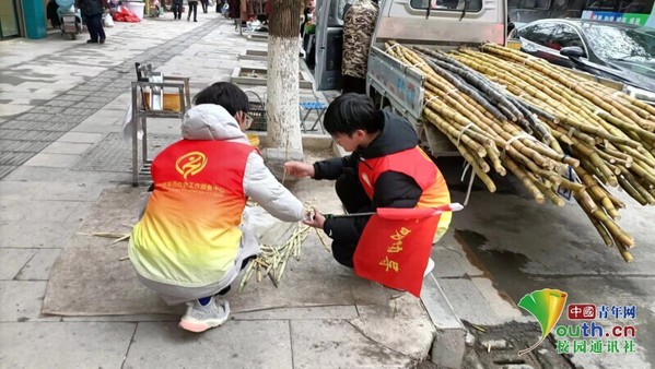 图为实践团队进行街道甘蔗皮清理。中国青年网通讯员王雨娟摄