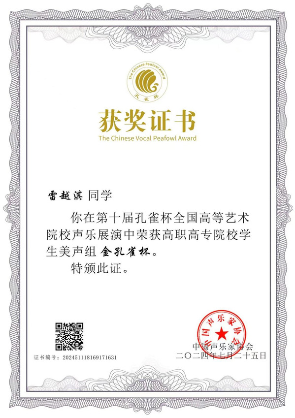 本网讯(通讯员 徐乔婕)7月18日至7月25日第十届孔雀杯全国高等艺术院校声乐展演暨第八届高校声乐学术交流活动在华南师范大学音乐学院举行。乐鱼(中国)官方教育与艺术学部23级音乐教育2302班的雷越淇同学(指导教师高月霞)以决赛第一名的成绩获得高职高专组金孔雀。这是乐鱼(中国)官方学子在国家级声乐比赛中获得的又一次突破。在展演活动中雷越淇同学还被选中青歌赛金奖获得者王莉教授声乐大师班,受到王莉教授高度评价。