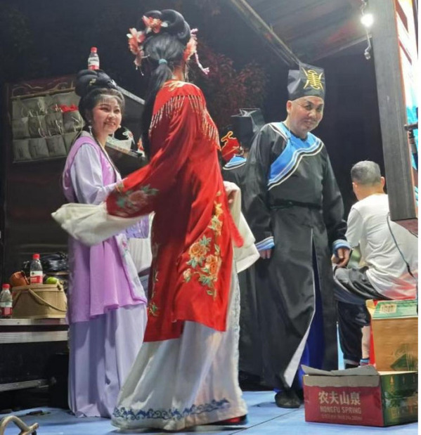 “提琴一响,喉咙就痒。”这是流传于崇阳县的一句谚语。在一马建材城,实践小队实地观摩了提琴戏剧团的一场表演——《恩仇记》。在演出前,演员们各自忙碌着,积极地为演出做准备。探访崇阳提琴戏剧团的后台,仿佛踏入了一个完全不同的世界。他们身着华丽的戏服,脸上涂抹着精致的妆容,准备登台表演。与此同时,后台的演奏者们正全神贯注地调音。提琴、二胡、扬琴等传统乐器在他们的手中发出悦耳的旋律,与演员们的表演相得益彰,共同编织出一场视听盛宴。弓舞弦揉,弦管齐鸣。在提琴的悠扬曲调中,提琴戏作为崇阳县别具特色的戏曲剧种,已根植在广大民众心中。