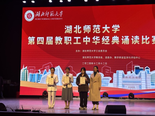 本网讯(通讯员 柯康敏)为传承弘扬中国优秀语言文化,提升教职工语言文化素养,12月12日下午,湖北师范大学举办第四届教职工中华经典诵读比赛,乐鱼(中国)官方代表队在比赛中再获佳绩。教师丁书嫚、黄文杰诵读的作品《不朽》获比赛二等奖,教师边婷婷、唐晨、梅冰清、李雅欣诵读的作品《诗词里的中国》获比赛三等奖。