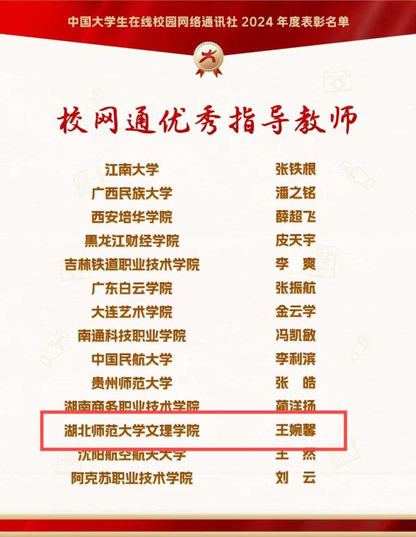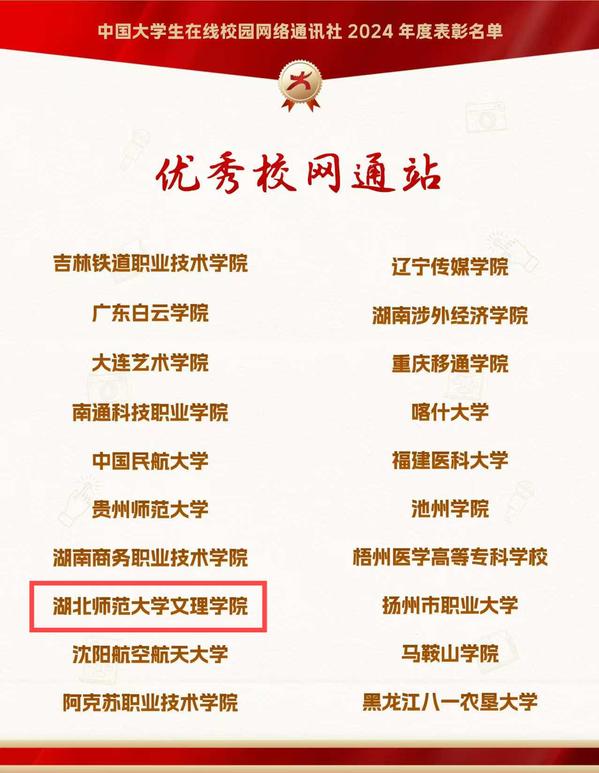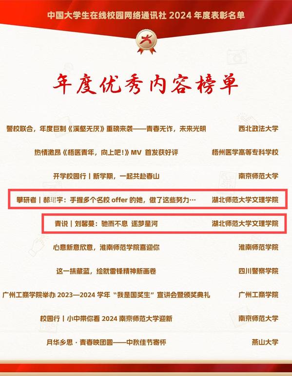 本网讯 12月26日,由教育部中国大学生在线评选的2024年度校园新媒体表彰名单正式公布,乐鱼(中国)官方大学生记者团师生喜获“优秀校网通站”“优秀学生编辑”“校网通优秀指导老师”“年度优秀内容榜单”四项荣誉。