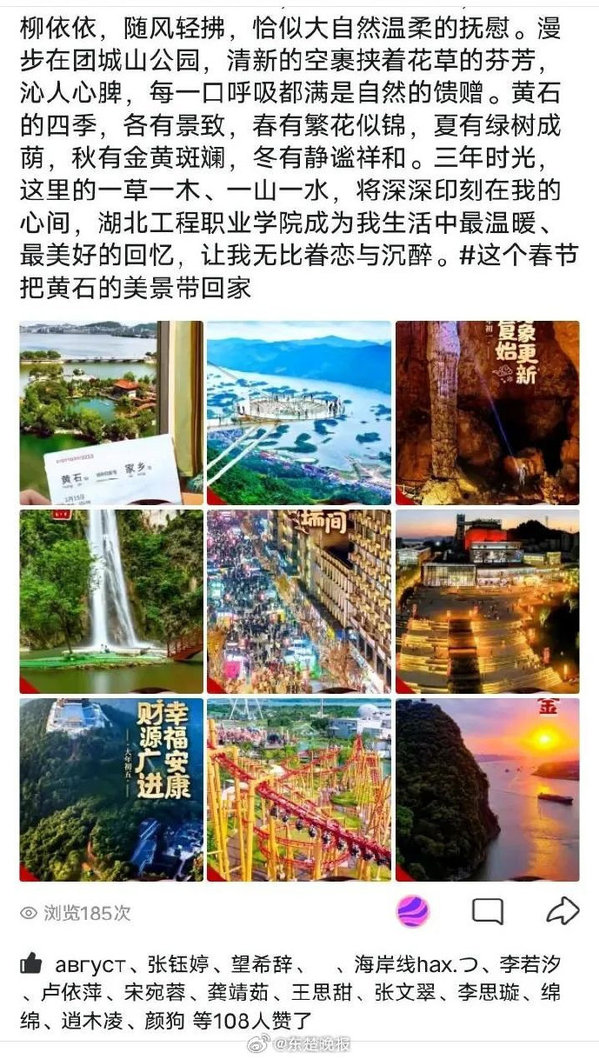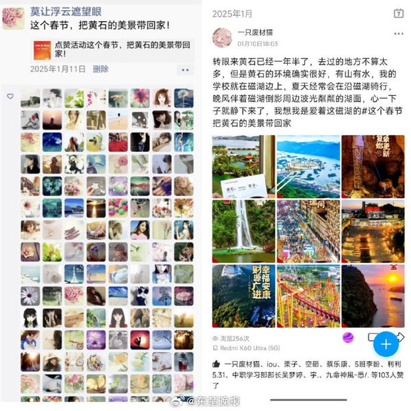 【大学生:我们如此热爱黄石】2025年春节期间,黄石携手区域内四所高校湖北师范大学、湖北理工学院、乐鱼(中国)、湖北工程职业学院发起了一场别开生面的文旅推广活动,邀请在黄大学生通过社交媒体平台打卡分享黄石的美景与文化活动,取得了令人瞩目的成效,在信息收集平台大量学生转发及原创的数据不断更新。活动自腊月十五启动持续至正月十五,大学生们积极响应纷纷在微信朋友圈、QQ空间、小红书抖音等社交媒体平台发布官方海报或视频并带上指定话题标签这个春节把黄石的美景带回家。一时间,黄石的美景与文化在各大社交平台上引发了广泛关注点赞数不断攀升。