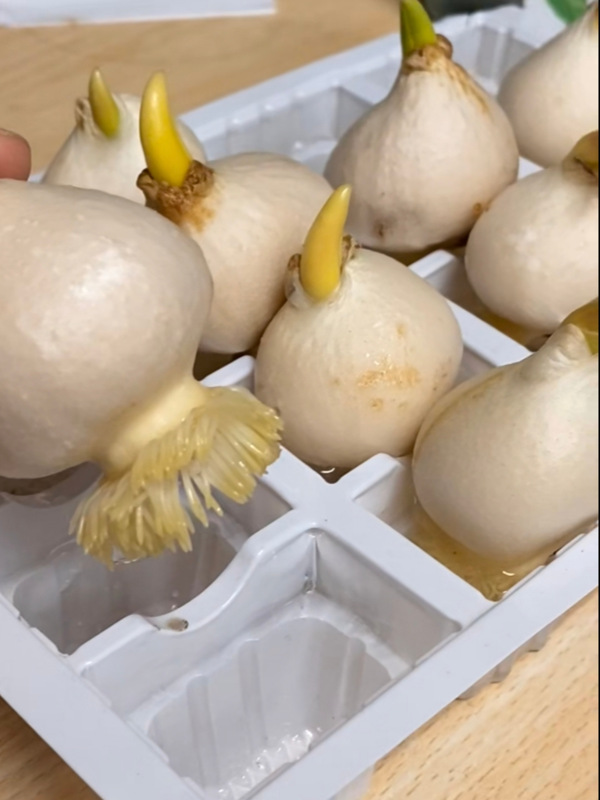 最初五天像等待解冻的冰层,球根始终保持着瓷白的沉默。每天晨起下床,总看见它安静地悬浮在玻璃与水的结界里,连水线蒸发的痕迹都清晰可辨。直到某个飘着冷雨的傍晚,忽然发现球茎底部渗出几缕乳白丝线——那是根系初生的絮语,在暮色里泛着珍珠母贝的光泽,如同少女初次垂落的长发。