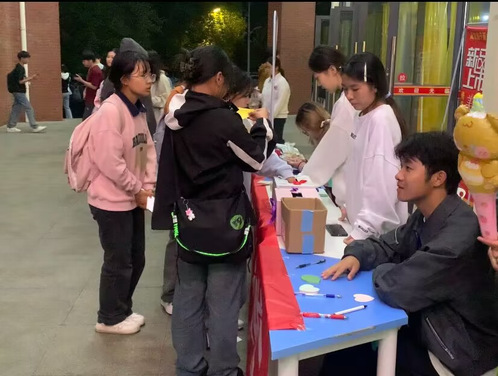 活动开始前,校心理部成员布置场地,挂起横幅,陈列海报。心理部部长有序组织各干事们进行活动开始前的统筹工作,为同学们准备了有趣的互动小游戏。为保证活动顺利进行,提前一天下发宣传稿,并准备了丰厚的奖品,以及抽奖箱、便签纸、中性笔、海报和横幅等物资,做好了充分准备。10月15日中午11:40,在场校心理部干事们热情邀请同学前往摊位,为其介绍并宣传《晓心期刊》征稿活动,并鼓励同学们写下自己的祝福或疑问。或在回答心理问题测试后,即可获得一次抽奖机会,奖品种类繁多,比如糖果、明信片、小挂件等。本次活动收集到的心理困惑或问题,将有机会得到心理中心老师的解答,并拍摄成为师生问答视频发布于校心理部抖音公众号“晓心来咯”。随着暮色降临,本次活动于当晚19:00取得了圆满结束。