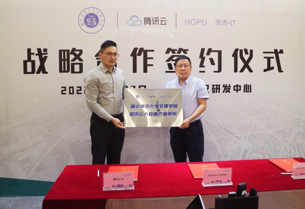 2022年6月23日,乐鱼(中国)官方与腾讯云计算(北京)有限责任公司、武汉厚溥数字科技有限公司在腾讯武汉研发中心举行“产教融合共建腾讯云大数据产业学院”签约仪式。学校董事长李咏成、院长李开灿、常务副院长杨学斌、副院长张志华、副院长王胜国出席签约仪式。