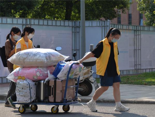 学校会让家长安心吗?986人次的志愿者行动起来了。“你的事,我帮办”,这算是学兄学姐给学弟学妹见面的第一个承诺。从进校门开始,引导到各学部迎新点,再引导学生办理入学手续,热情周到;行李从卸车到装车,转运宿舍,再到卸车入舍,志愿者热火朝天,挥汗如雨。手续,保证一个不少,行李,保证一件不落。暖心的一幕又一幕,在不同的宿舍同样地上演着。事无巨细的全程服务,赢得了新生的赞许,家长的放心。