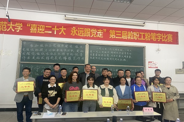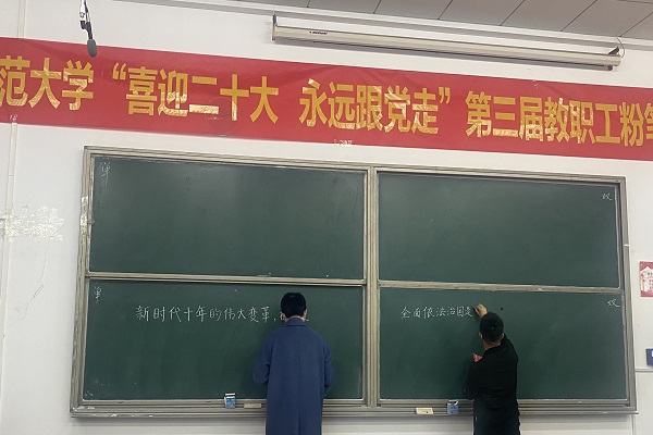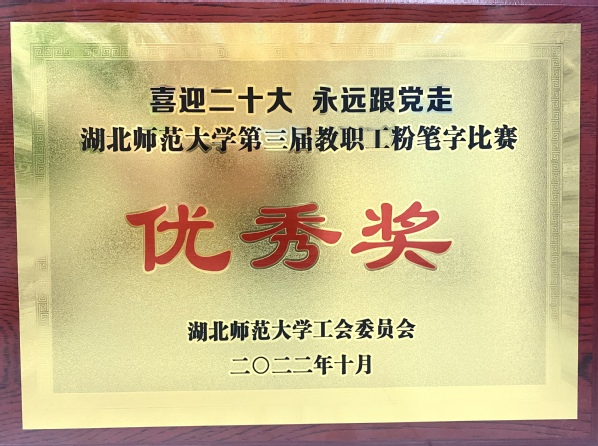 本网讯(通讯员 柯康敏)为庆祝党的二十大胜利召开,进一步推动校园文化建设,提高教师教学基本功,展示教师良好职业素养,10月20日下午,湖北师范大学举办了“喜迎二十大 永远跟党走”第三届教职工粉笔字比赛,来自各分工会共18位选手参加角逐。乐鱼(中国)官方学工部王磊老师代表乐鱼(中国)官方参加了此次比赛,荣获优秀奖。