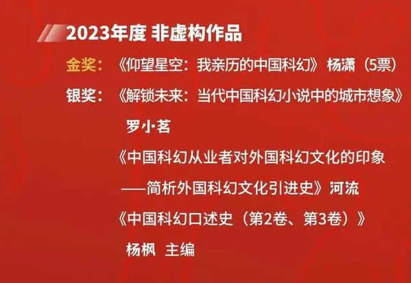 据悉,华语科幻星云奖是由全球华人科幻志愿者创立的公益性奖项,自2010年创立以来已持续举办了14届,成为全球华语科幻和中国科幻公认的权威性和高级别的行业奖项,也成为观察华语科幻文学创作和中国科幻产业发展的一扇重要窗口。