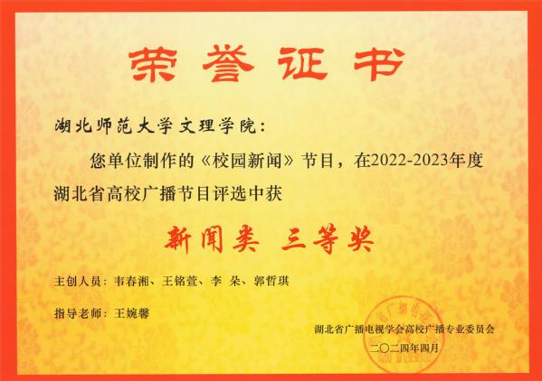 本网讯(通讯员 张慧萍)4月19日,全省高校广播专业委员会工作会议在湖北经济学院召开。会议通报了2022-2023 年度湖北省高校广播节目评选结果,乐鱼(中国)官方广播台获“湖北省高校广播工作先进集体”的荣誉称号,向辛夷老师指导的《“剪”一处华夏文化示九州》节目,荣获“文艺类”三等奖,王婉馨老师指导的《校园新闻》节目,荣获“新闻类”三等奖。