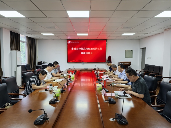 本网讯 7月11日上午,市委宣传部副部长、市文联党组书记梅定祥,市委宣传部宣教科科长陆文龙、副科长柯婷一行来校,就高校思想政治工作召开专题调研座谈会。党委书记杨邓红出席座谈会,宣传部、学工部、教务部、马克思主义学学部等单位负责人参加座谈会。