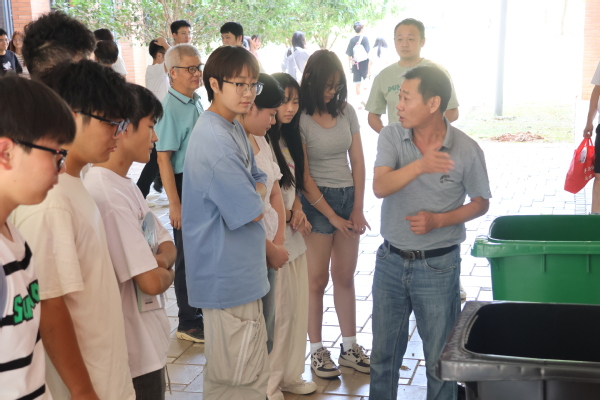 活动最后,同学们在教学楼外以实践的方式参与到垃圾分类中来,亲自体验如何区分各类垃圾,让垃圾分类落在实处。