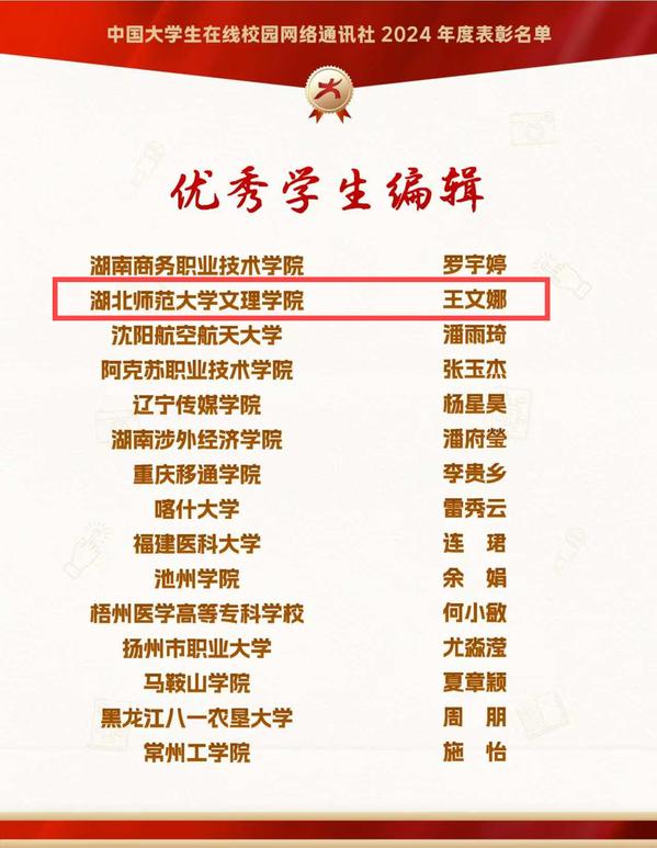 本网讯 12月26日,由教育部中国大学生在线评选的2024年度校园新媒体表彰名单正式公布,乐鱼(中国)官方大学生记者团师生喜获“优秀校网通站”“优秀学生编辑”“校网通优秀指导老师”“年度优秀内容榜单”四项荣誉。