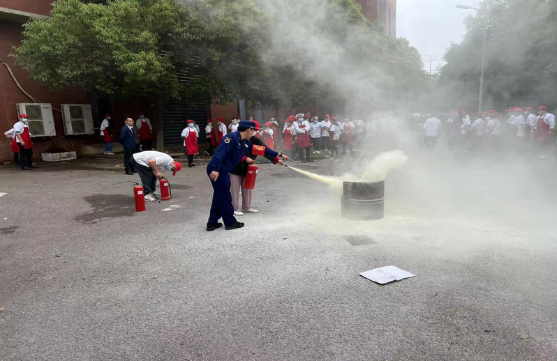 培训中,消防大队吴教官重点讲解了食堂火灾发生的原因、怎样预防火灾、初期火灾扑救流程和火场逃生基本技能,以及食堂油锅着火的正确处理方法和如何正确报警等知识。随后,现场组织了消防灭火演练,吴教官对干粉灭火器的使用方法和消防水带的连接使用进行了讲解和实地操作。