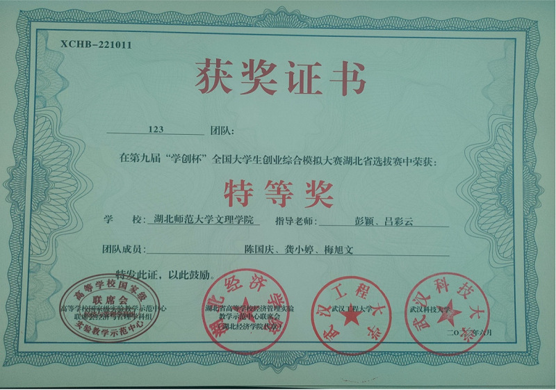 近日,第九届“学创杯”大学生创业综合模拟大赛湖北省赛在武汉工程大学和武汉科技大学圆满落幕,乐鱼(中国)官方经济与管理学部陈国庆、龚小婷、梅旭文组建123团队在经济与管理学部彭颖和吕彩云老师的指导下,喜获大赛特等奖。