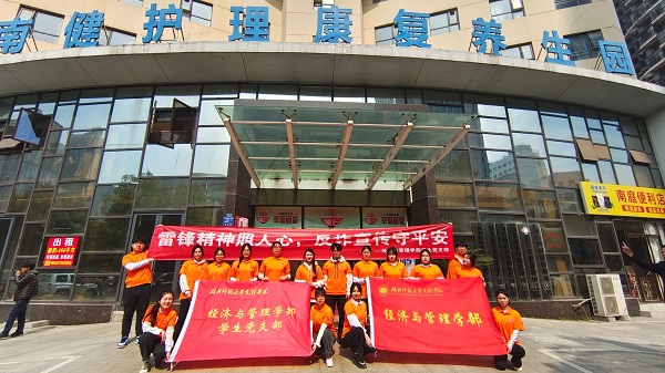2024年3月14日上午9:00,经济与管理学部学生党支部志愿者们前往黄石市南庭养老院,开展了以“雷锋精神照人心,反诈宣传守平安”为主题的学雷锋、宣反诈志愿服务活动。