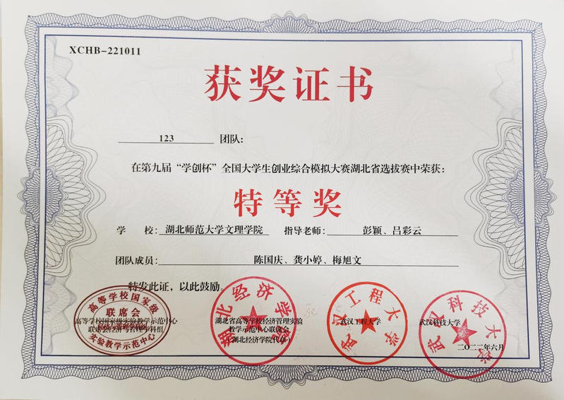 在第九届“学创杯”全国大学生创业综合模拟大赛湖北省选拔赛中荣获特等奖