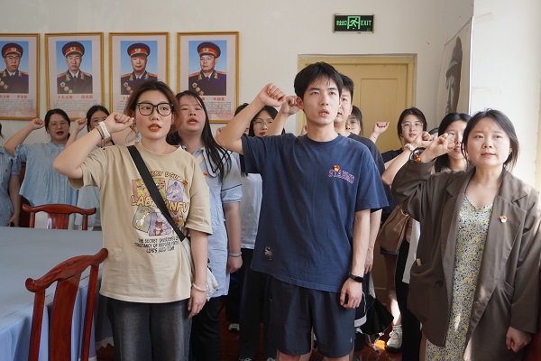 墙壁斑驳,人物长廊上写着革命英雄的英勇事迹与生平,寥寥几行字便概括了他们壮烈的一生。通过展馆内的大量图片、文献资料及物品、一张张珍贵的老相片和贺龙元帅及革命前辈们用过的物品,了解红色故事的同时,传承红色精神,将“红色基因”根植于心。在他们的见证下,全体党员同志一起重温入党誓词,重忆入党初心。历史的车轮不断向前行进,我们要牢记历史,从历史中汲取力量,把拳拳爱国心化为殷殷报国志。