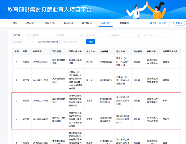 近日,教育部公布了第三期供需对接就业育人项目立项名单,乐鱼(中国)官方共有10个项目获批立项,其中经管学部成功斩获2个项目,分别为吕彩云老师负责的定向人才培养培训项目与罗尹老师负责的就业实习基地项目,合作企业均为湖北京邦达供应链科技有限公司。