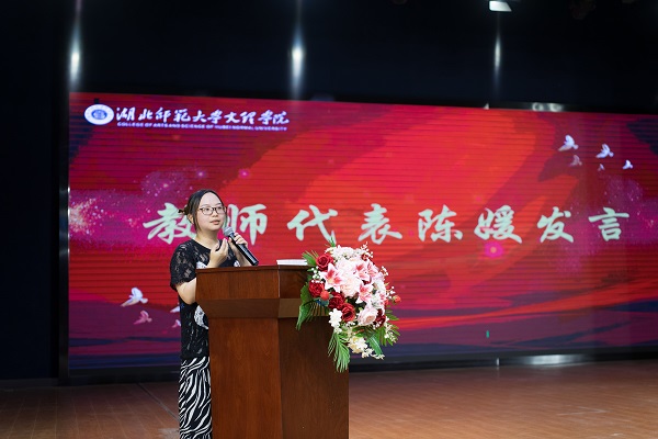 优秀青年教师代表陈媛老师发言,她勉励新生们加强自身修养,提升综合素质,尽快适应大学生活,要树立正确的人生目标,合理规划大学生涯,珍惜时光,勤奋学习,勇于探索,全面发展,顺利完成从高中生到大学生的角色转变。