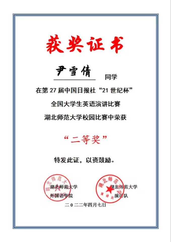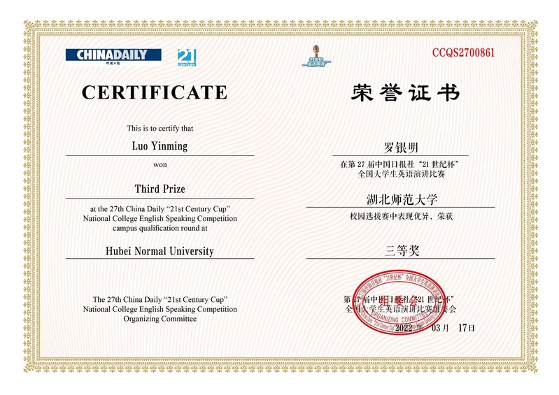 罗银明等三名同学在中国日报社“21世纪杯”全国大学生英语演讲比赛中获奖