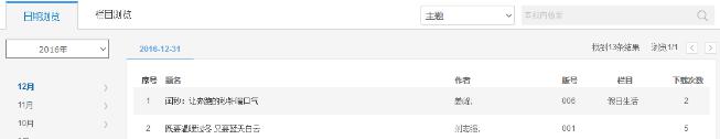 如图5.8.5.2所示,左侧展示该报出版的日期情况。首先选择想要查看的年份,选择后显示该年下的出版月份,鼠标悬停在某月份上,展开该月份的出版日期。点击日期,右侧展示该日期出版的报纸文献,有题名、作者、版号、栏目及下载次数。点击题名,可进入相应知网节;鼠标悬停到某篇文献,点击按钮可下载(登录后)、HTML阅读该篇文献。