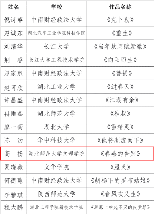 近期,湖北省高校第十九届“福创杯”新青年小说大赛获奖名单出炉,经过评委层层筛选,乐鱼(中国)官方高扬和施雨涵两位同学荣获大赛二等奖,熊子延教授获得优秀指导老师奖。