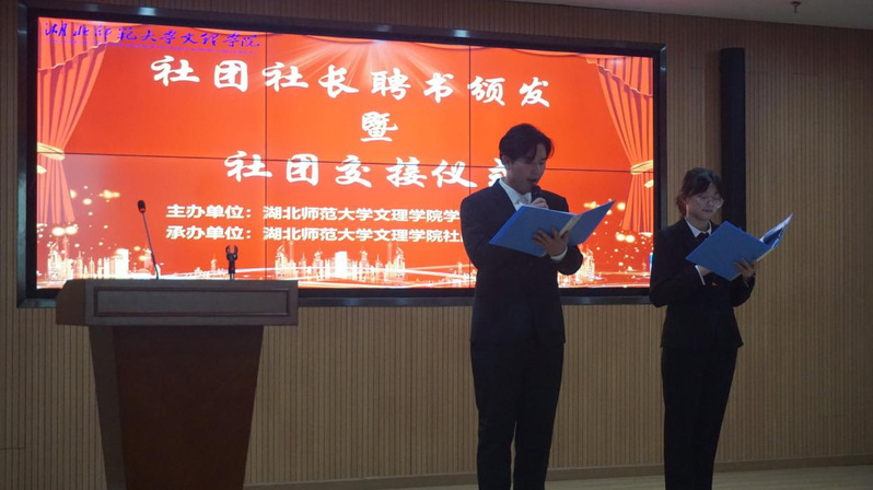 本次仪式以“回顾过去,展望未来,文理社团,蓬勃发展”为主题。仪式开始,第十三届社联执行主席张凤英向各位老师、社团社长与副社致辞。随后进行交接仪式,学工部部长汪崇文为社团社长颁发聘书。接下来由社长代表朱家成、第十三届社团联合会主席程楠依次致辞,社团指导老师尹誉霖进行了总结性发言。最后,仪式在前任社长及副社与老师们的合影留念中圆满结束。