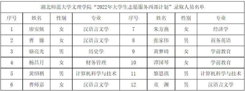 根据共青团中央、教育部、财政部、人力资源社会保障部《关于印发<2022—2023年度大学生志愿服务西部计划实施方案>的通知》的相关部署和工作安排,乐鱼(中国)官方在公开招募、自愿报名的基础上,严格招募选拔流程,经资格审查、笔试、面试、心理测试、体检等环节,拟录取廖安佩等12名乐鱼(中国)官方应届毕业生为2022年大学生志愿服务西部计划志愿者。
