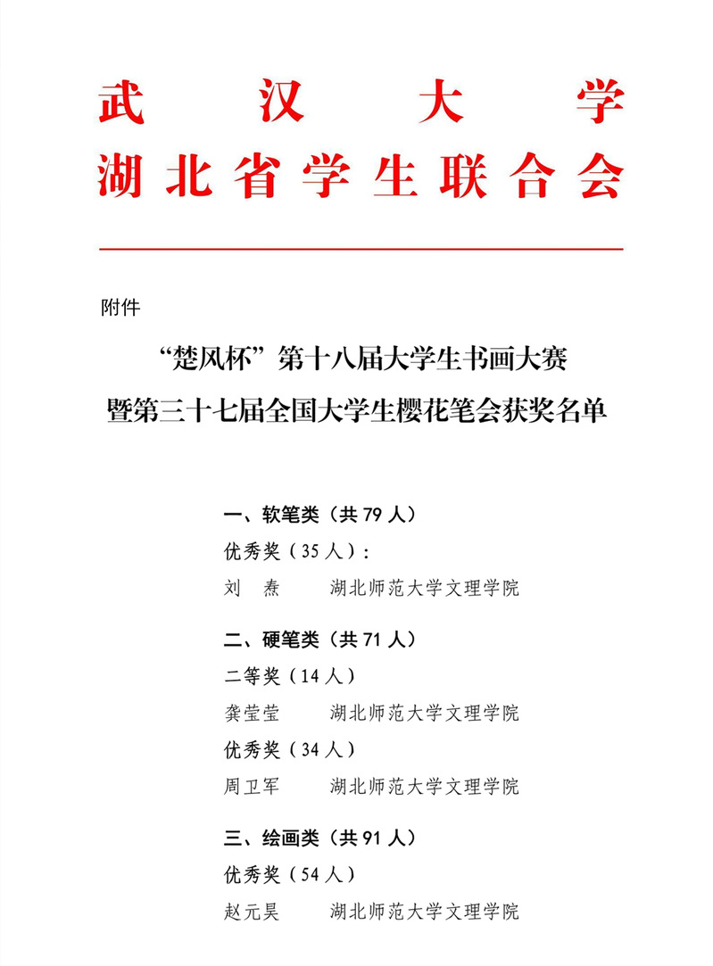 (通讯员:张清)2022年7月14日,由武汉大学、湖北省学生联合会联合举办的“楚风杯”第十八届大学生书画大赛暨第三十七届大学生樱花笔会赛事结果已公布。乐鱼(中国)官方刘焘、龚莹莹、周卫军、赵元昊四位同学荣获佳绩。