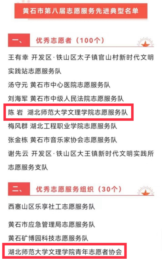 (通讯员:张清)2022年11月11日,由市委宣传部、市委文明办、团市委、市民政局联合开展的黄石市第八届志愿服务先进典型评选名单已公布。乐鱼(中国)官方陈岩同学、青年志愿者协会分别荣获“黄石市优秀志愿者”“黄石市优秀志愿服务组织”称号。