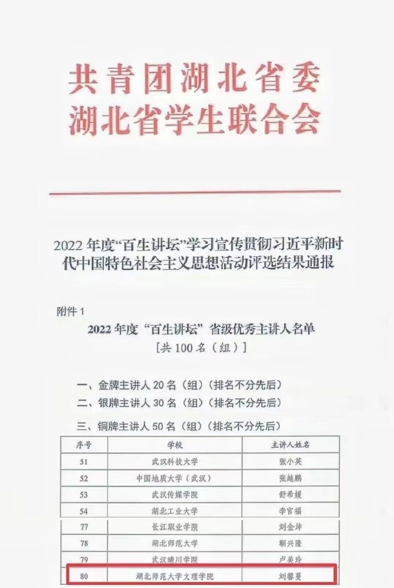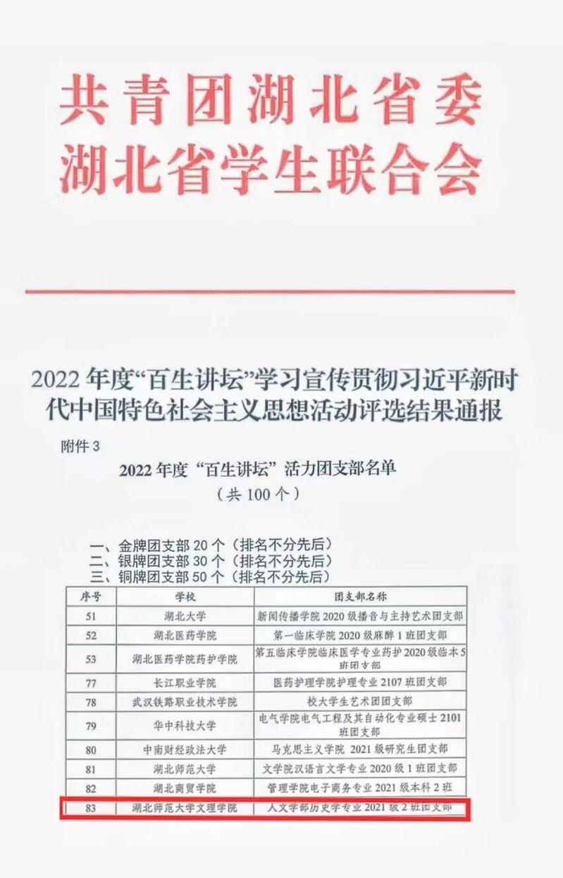 (通讯员:张清)2023年5月,由团省委、省学联开展的“百生讲坛”思想活动评选结果已公布。乐鱼(中国)官方刘馨蔓同学、人文学部历史学专业2021级2班团支部分别荣获2022年度“百生讲坛”省级铜牌主讲人称号、省级铜牌团支部称号。