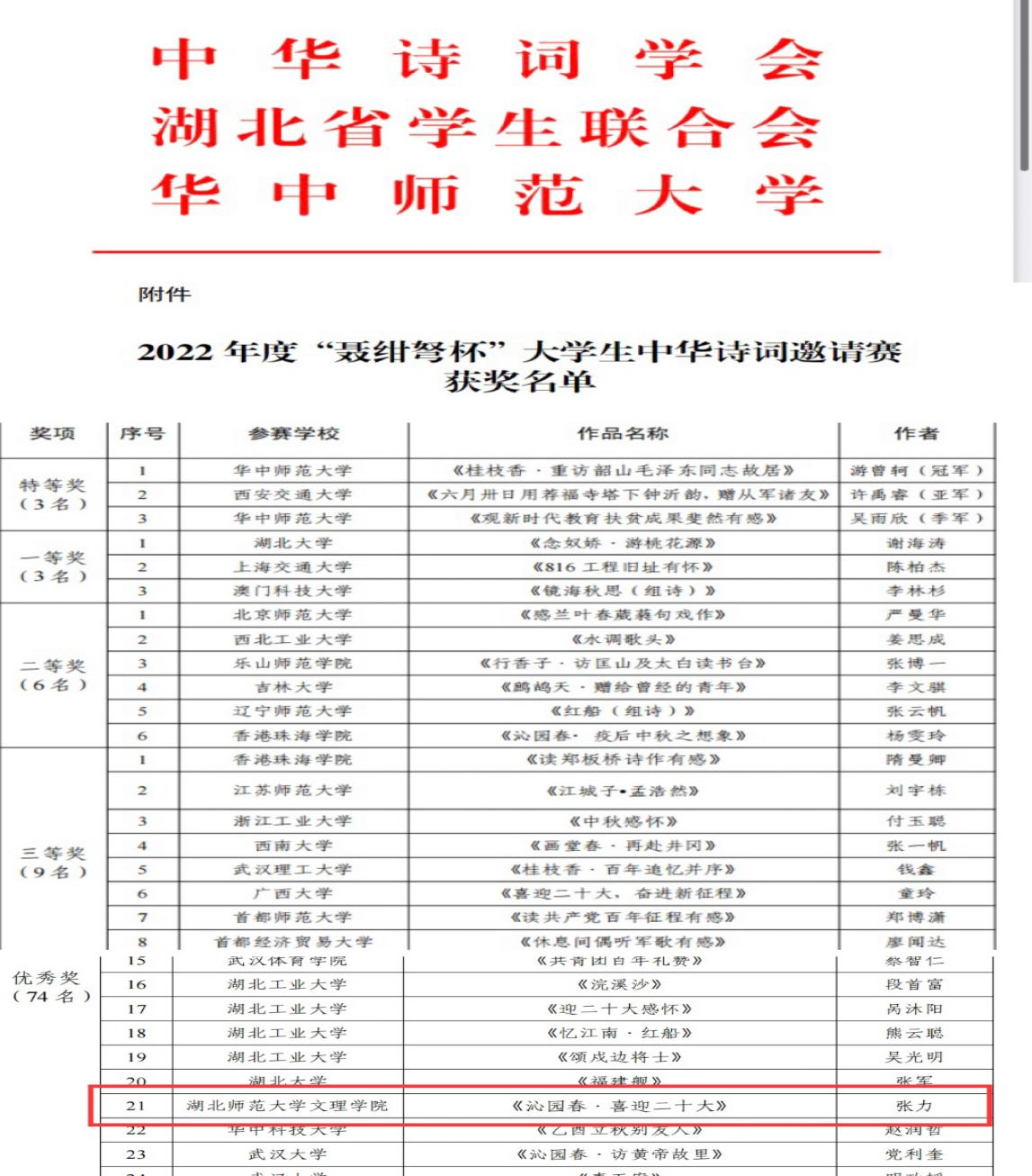 (通讯员:苏祎)6月6日,由中华诗词学会、中华诗词研究院、湖北省学生联合会、华中师范大学联合举办的2022年度“聂绀弩杯”大学生中华诗词邀请赛赛结果已公布。乐鱼(中国)官方张力同学荣获佳绩。