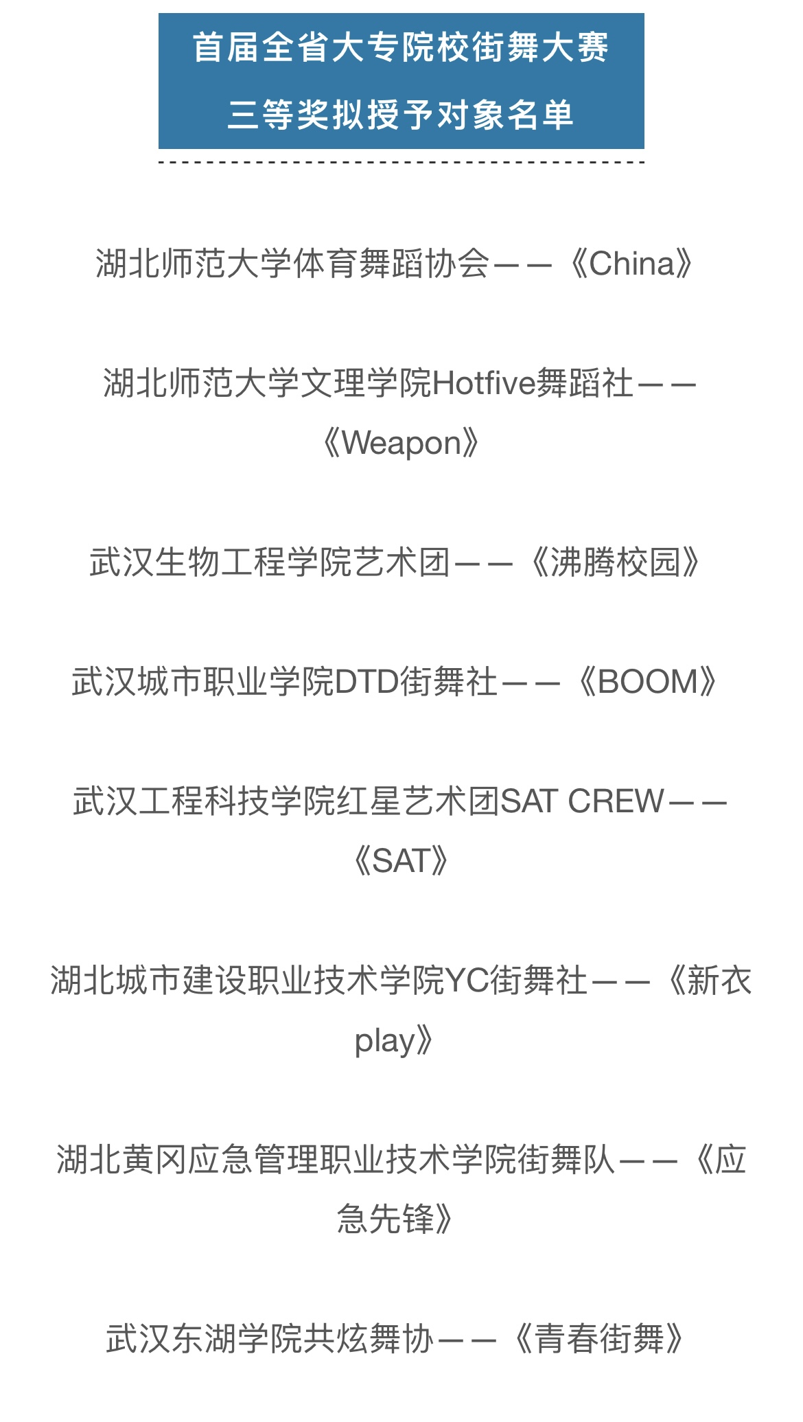 (通讯员:苏祎)引领新风尚,欢悦新时代。9月10日,首届全省大专院校街舞展演在黄冈市遗爱湖公园举办。乐鱼(中国)官方代表队“Hot Five舞蹈社”的舞蹈作品《weapon》在此次比赛中荣获三等奖。