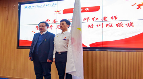 在学员们铿锵有力的歌声中,青年马克思主义者培训工程第一期培训班开班仪式就此拉开序幕。党委书记杨邓红老师为培训班授旗压轴,旗帜飞扬预示着青马学员们终将鸿鹄得志,开启学习新篇章。