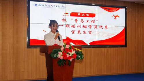 之后,学员代表望晨上台发言,表达出学员对“青马工程”的期待和信心,希望学员们能够努力成长为“三手”,即“学习的能手”,“老师的助手”,“同学的帮手”,自觉培养勇于担当、甘于奉献的高尚精神境界,提高能力水平、增强能力素质、升华思想境界,为成为一名真正的青年马克思主义者而努力奋斗。