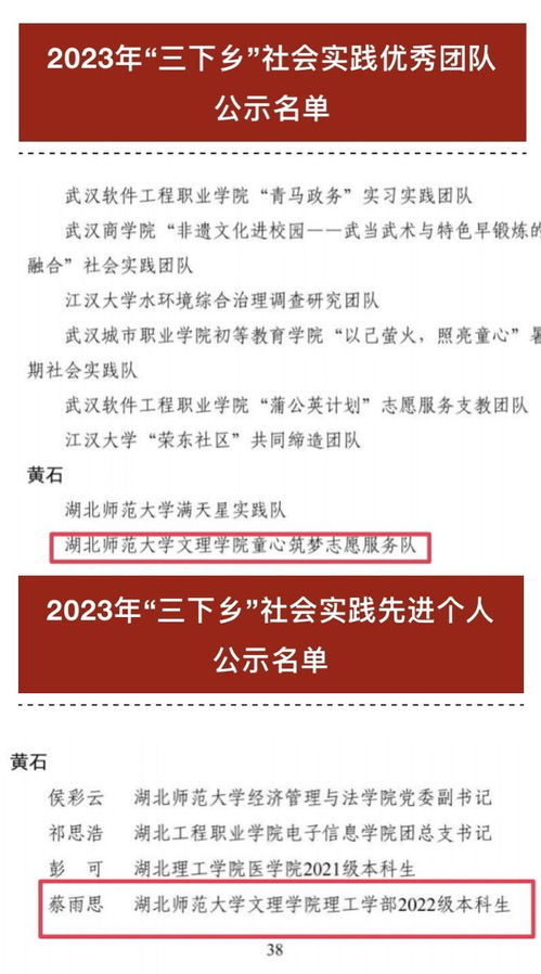 (通讯员:王梓千寻)湖北省大中专学生志愿者暑期文化科技卫生“三下乡”社会实践活动总结通报结果已公布。乐鱼(中国)官方童心筑梦志愿服务队被评为“三下乡”社会实践优秀团队,理工学部2022级本科生蔡雨思同学被评为“三下乡”社会实践先进个人。