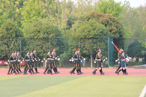 在全体师生的注目礼下,国旗护卫队队员们护送鲜艳的五星红旗进场,伴随着庄严的国歌,五星红旗冉冉升起,迎风飘扬。