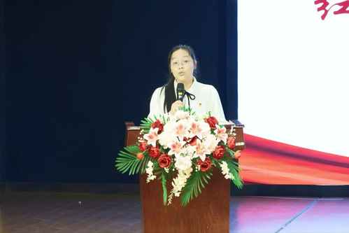 红旗团总支人文学部团学指导老师胡玉文代表红旗团总支发言。她表达了对校党委、校团委及人文学部各级领导的感谢,并总结了人文学部团总支在过去一年取得的各项成绩。她表示,未来将持续从思想引领、组织建设与优化服务体系三个方面发力,带领广大团员青年踔厉奋发,勇毅前行。