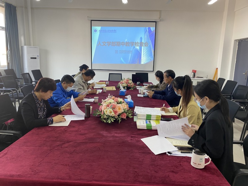 20221110日上午八点半,人文学部在3号实验楼508会议室组织召开了期中教学检查会,参加此次会议的有文理学院常务副院长杨学斌、教务部部长潘继斌、教学督导刘金梅、教务处周文老师、人文学部主任熊子延和学部教学办行政办相关工作人员,本次会议主要包括以下几方面议程:一,熊主任从教师教学、课程建设、教研室建设、青年教师成长培养等方面汇报了学部的教学工作,为了加强教学管理,本学期安排了辅导员和教学秘书深入课堂检查;二,教学办副主任甘启敏汇报了期中教学检查过程中反映的相关问题,如周末自习室太少,汉语言专业教师少任务重,举办讲座等学术活动缺少相应补贴等,希望学校能切实解决反映上来的这些问题;三,潘部长强调了质量工程建设,希望学部坚持青年教师培养,着手迎接教师评估工作;四,杨院长首先肯定了学部的工作和成绩,然后针对反映的一系列问题给出了相应的解决建议,强调要抓好师德师风、课程思政、青年教师教科研等方面的建设,对于举办学术讲座打造学部特色文化时要做好意识形态监管;五,刘老师希望以后学部在工作总结报告上能把内容呈现得更加全面,细节、亮点、特色等方面写得不够详细具体,过于简单,应该把已经落实和推进的工作尽量都呈现出来;六、周文老师希望以后老师们能把试卷装订得更加规范。