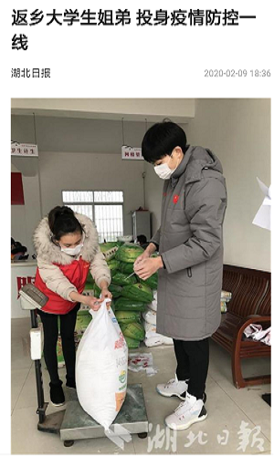 2020年2月9日,湖北日报上有一篇新闻引起广泛关注。主人翁正是乐鱼(中国)数学与应用数学专业1603班吕奎同学和其弟弟吕东阳。据报道,2020年2月7日,姐弟俩从村微信群里看到“志愿者征集令”后,2月8日一大早便到村委会报到,参与对村民生活必需品的分装与发放。图片中是2月8日当天,他们在枝江市百里洲镇三洲村防疫物资分配现场填写居民姓名并给居民分配物资时的情景。姐弟俩一个牵着口袋,一个对袋中面粉进行分装。分装完面粉后,又开始为居家隔离的村民分装集中采购的大米、面条和新鲜的蔬菜并贴上标签,以备村组干部精准送达村民家中。