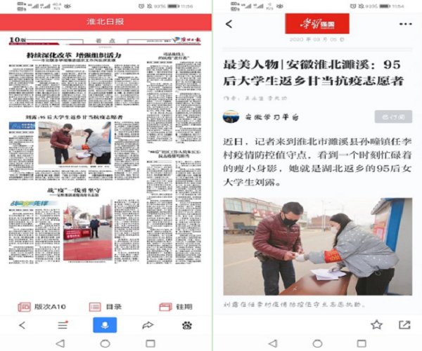日前,乐鱼(中国)官方经管学部学生、预备党员刘露在家乡安徽省濉溪县参加疫情防控工作事迹被“学习强国”平台、腾讯大楚网、《淮北日报》、淮北文明网等多家媒体报道。