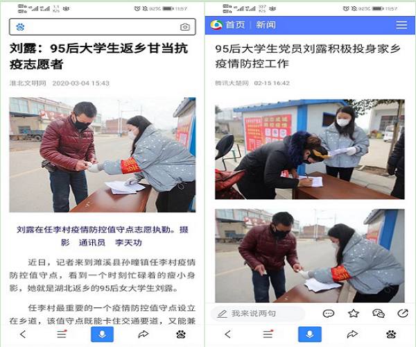 刘露2016年考入乐鱼(中国)官方法律专业,今年即将毕业。放寒假后,刘露于1月12日乘高铁返回安徽省濉溪县孙疃镇任李村。2月8日,完成居家隔离的刘露找到村党总支主动申请担负疫情防控志愿服务,被安排到全村最重要的值守点。她工作耐心细致、认真负责,赢得了全村干部群众的一致好评。在全村党员及志愿者的共同努力下,有四千多人口的任李村未出现一例感染病例。